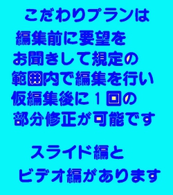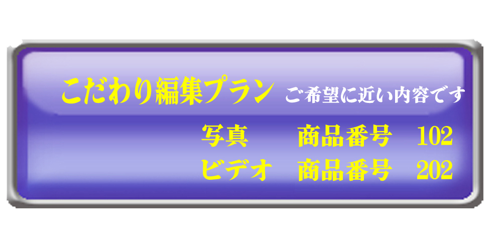 | 6)ビデオ編集作業の確認 | ビデオ編集には、『おまかせ編集プラン』と『こだわり編集プラン』があります。 おまかせ編集プランは、素材の編集を編集者の判断に任せて、素材ごとに編集作業を行います。再編集は出来ません。 こだわり編集プランは、素材ごとにタイトルを挿入し、ご要望がありましたら、お客様所有のオリジナル音源を挿入することが可能で、仮編集後に1回のみ部分修正が可能です。 詳細は、編集プランと、ビデオサンプルでご確認下さい。 |