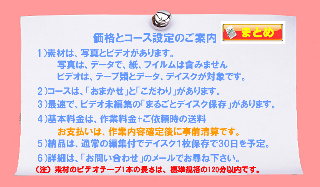 | 3)お預かり出来ますスライドとビデオ素材の形式について | 詳細は、『編集プランとビデオサンプル』をご覧下さい。 スライド用の素材:紙写真の編集は出来ません。SDカード、コンパクトデイスク、USB等のメデイアやCDR、DVD、Blu-ray等に 記録された画像データ 等 ビデオ用の素材: VHS,S-VHS,8mm,Hi8,DV,MiniDV,HDV等のテープ素材 |