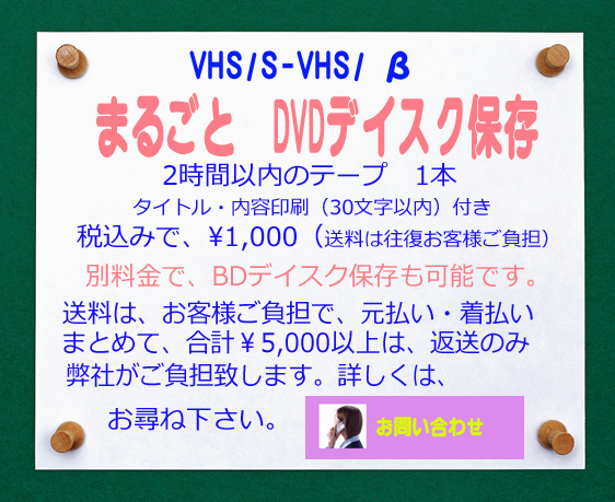 | 1)『思いdeデジタル化』ご利用方法の皆様へ | 編集を御依頼の皆様にご案内です 皆さんの貴重な映像財産の素材は、大半が撮影されまして、時間の経過とともに、素材の経年変化、劣化、破損、カビの発生等、保存環境によりましては、ビデオの編集が出来ない場合もございます。作業の依頼前に素材を確認してお送り頂きますようにお願い致します。到着後に利用出来ない素材がございましたらメールでご連絡を差し上げます。 重要:ビデオ素材の管理と保障につきまして お預かりしますビデオ素材は下記の状況から保障は出来ません。 ビデオ素材は、劣化が進んでいるケースもございますので、貴重な映像財産は、可能であれば、オリジナルのコピー等の保存を行って頂く事をお勧め致します。編集作業では機材の保守・管理・メンテナンス等と、作業には細心の配慮を行い作業致しますが、素材の保存状況や、思わぬアクシデント等の発生の可能性もございます。作業中や輸送中の事故や破損、紛失等も含めまして、誠に申し訳ございませんが、トラブル時の補修・修理及び、保障・賠償等は一切出来ませんので、ご理解・御協力を頂きますようにお願い申し上げます。 ご心配な方は編集のご依頼をお止め下さるようにお勧め致します。 |